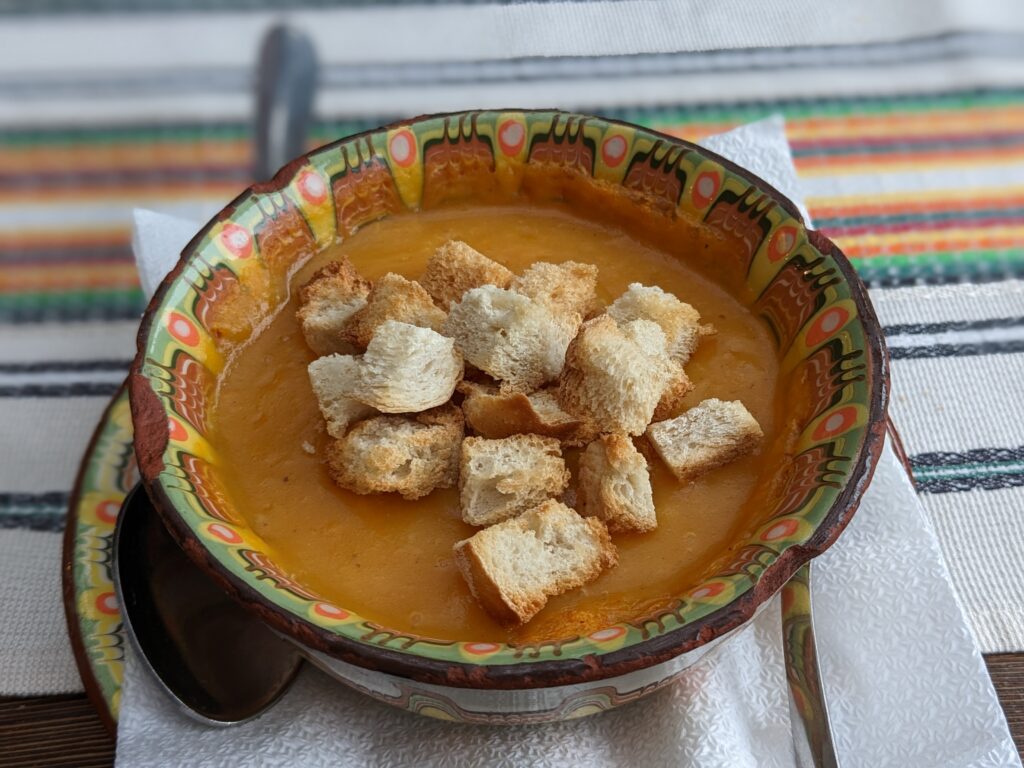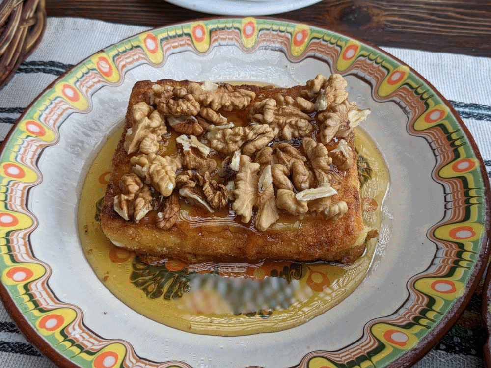 貸し切り状態だったゲストハウスでいただいたロドピ地方名物パタトニク(ブルガリア版オムレツ)が美味。オーナー家族の手料理はどれも素材の味が感じられる自然な美味しさで癒されました。